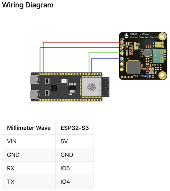 The power requirements for the C1001 are 5V and it consumes under 100mA, plenty for the onboard LDO except that is 3.3V. The DFRobot website has a really nice integration guide for the C1001, though it looks like it is connecting to a 5v controller. The ESP32-C6 is a 3.3v chip, as is the ESP32-S3 which is used in their wiring diagram. I found information about the UART voltage level on this site: UART Interface: 3.3 V TTL @ 115 200 bps.